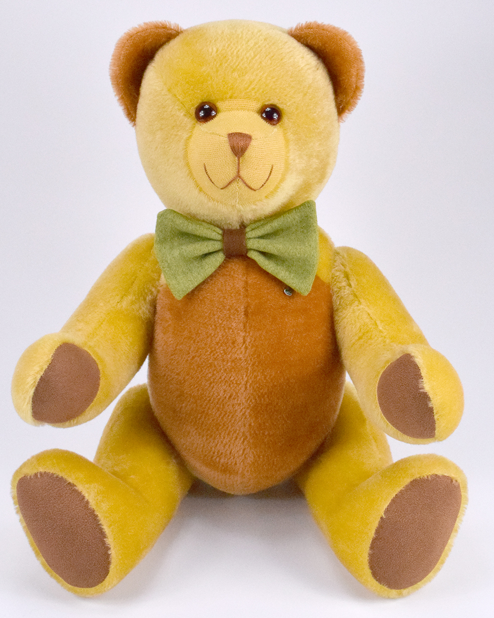Hergestellt aus weichem gelbem Kurzmohair, strahlt er Freundlichkeit und Wärme aus. Seine Bauch- und Ohrenpartien sind aus lebendig orangefarbenem Kurzmohair gefertigt, was ihm einen charmanten Kontrast verleiht. Mit seinen braunen Augen und seinem freundlichen Gesicht lädt „Großer Bruno“ zum Kuscheln und Träumen ein. Seine Brummstimme macht ihn zu einem besonderen Freund, der sicherlich für viele schöne Momente sorgt. Das kleine Detail, die grüne Fliege, verleiht ihm einen stilvollen und fröhlichen Akzent.