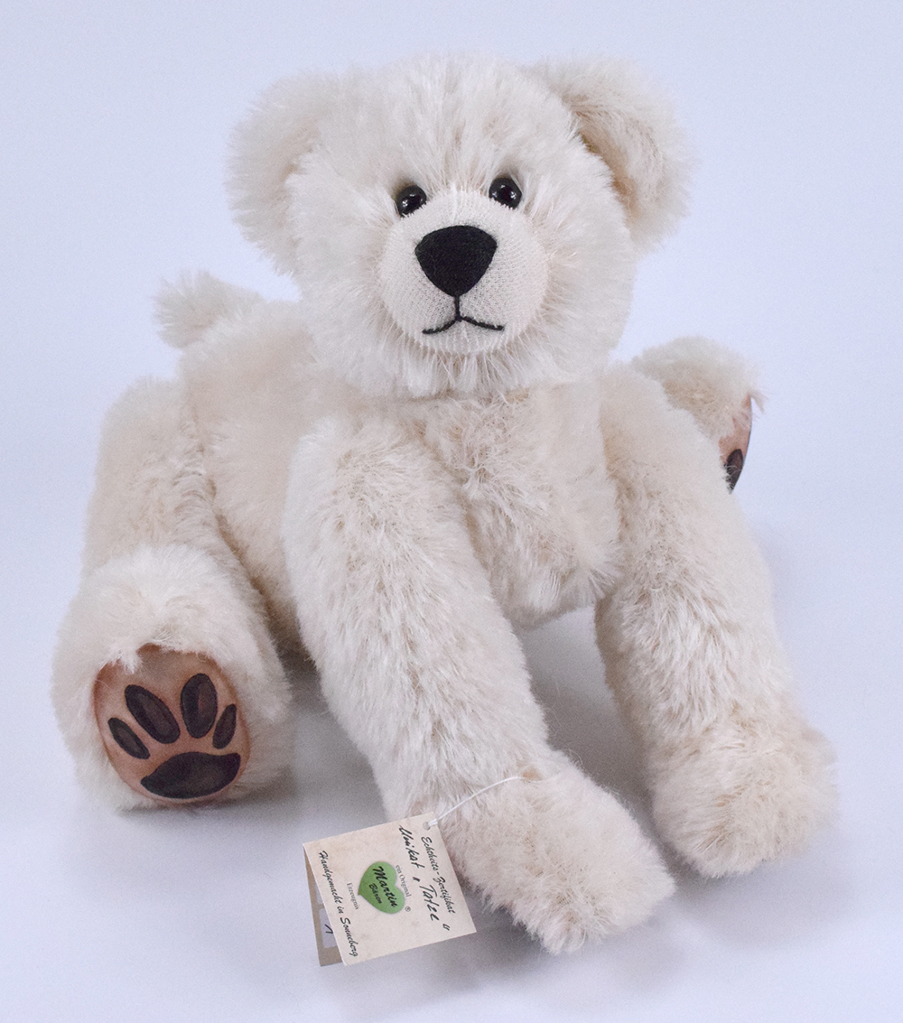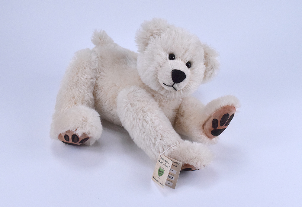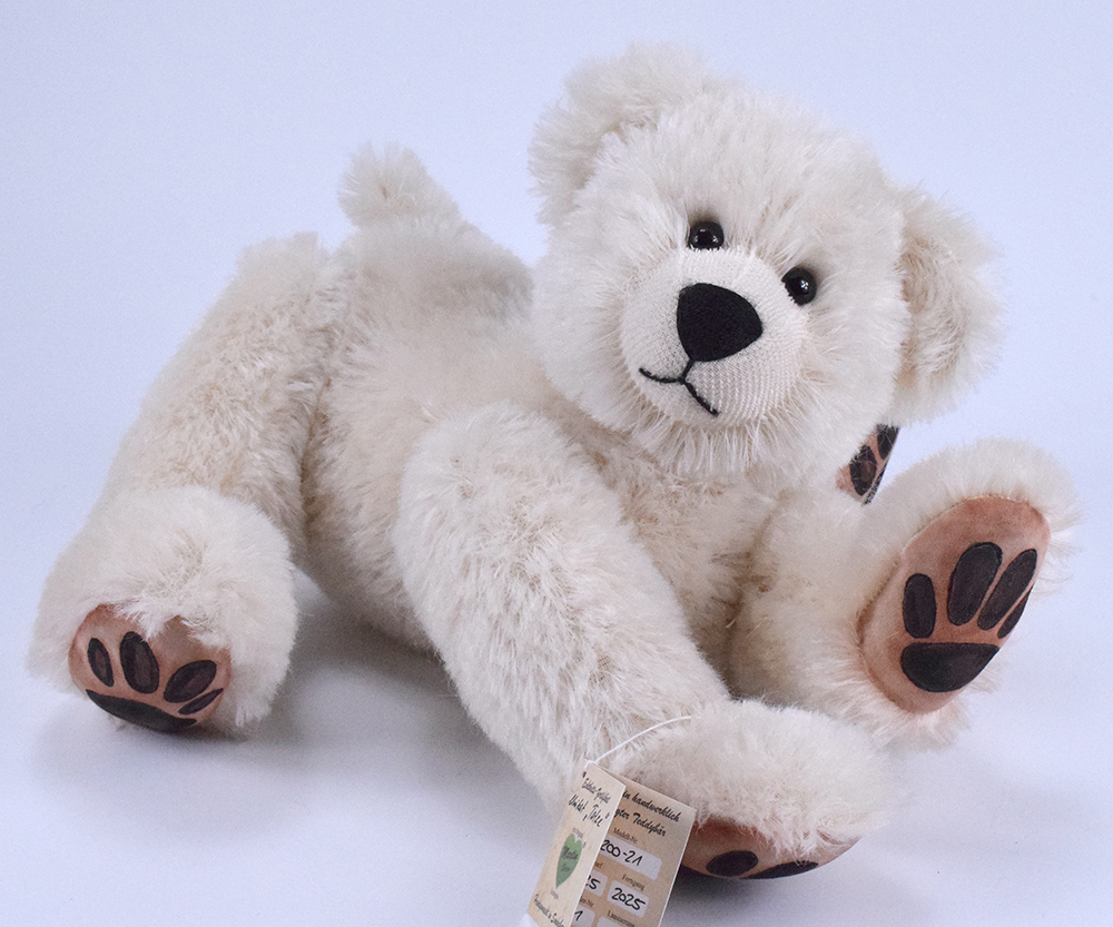 Teddybär Tatze möchte Spielen! Ganz süß sitz der 43cm große Laufbär und schaut erwartungsvoll und neugierig drein. Dabei zeigt er keck seine Sohlen und Pfoten, die kunstvoll mit Tatzen bemalt sind. Der Teddybär wurde aus naturweißem Rohmohair gefertigt und ist mit Holzwolle gefüllt. Durch die Körperform kann ich verschiedene niedliche Positionen einnehmen.